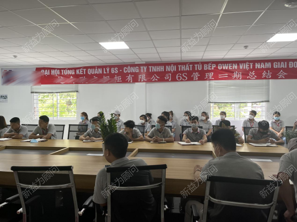 近日,越南某家具公司在會議室召開了6S管理項目第二期總結大會,對本期6S工作開展以來進行回顧與總結,此次參會的有越南某家具公司董事長何總,常務副總羅總,領導小組成員,推進辦主任范總,新益為顧問團隊,推進辦公室成員,以及推進小組各成員。