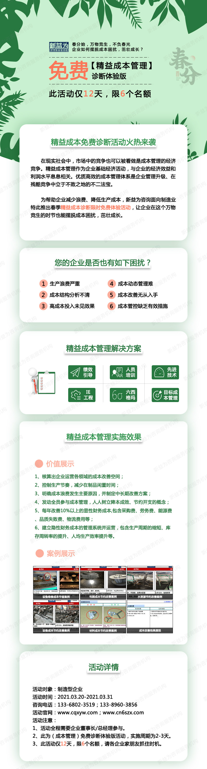 在現實社會中,市場中的競爭也可以被看做是成本管理的經濟競爭。精益成本管理作為企業基礎經濟活動,與企業的經濟效益和利潤水平息息相關。優質高效的成本管理體系是企業管理升級、在殘酷競爭中立于不敗之地的不二法寶。 為幫助企業減少浪費、降低生產成本,新益為咨詢面向制造業特此推出春季精益成本診斷限時免費體驗活動,讓企業在這個萬物競生的時節也能擺脫成本困擾,茁壯成長。